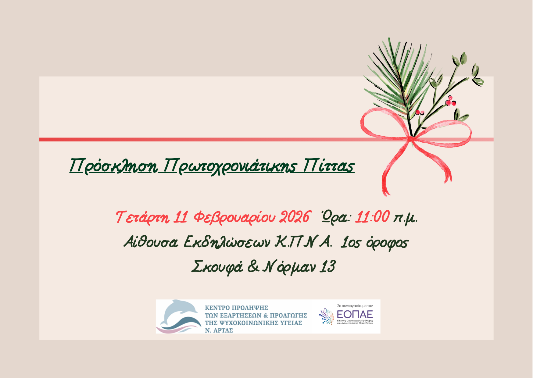 Το Κέντρο Πρόληψης των Εξαρτήσεων & Προαγωγής της Ψυχοκοινωνικής Υγείας Ν. Άρτας σε συνεργασία με τον Εθνικό Οργανισμό Πρόληψης και Αντιμετώπισης των Εξαρτήσεων (ΕΟΠΑΕ) στο πλαίσιο των προγραμμάτων του στην εκπαιδευτική κοινότητα, υλοποίησε βιωματικό εργαστήρι με θέμα: «ΕΞΑΡΤΗΣΕΙΣ–ΔΙΑΔΙΚΤΥΟ-ΒΙΑ» σε δασκάλους & νηπιαγωγούς διάρκειας δέκα (10) ωρών, στοχεύοντας στην ενδυνάμωση και την προαγωγή της ψυχικής υγείας και ψυχικής ανθεκτικότητας στο πλαίσιο του σχολικού περιβάλλοντος, για την καλύτερη προσαρμογή των μαθητών στη σχολική ζωή και στο ευρύτερο κοινωνικό πλαίσιο.