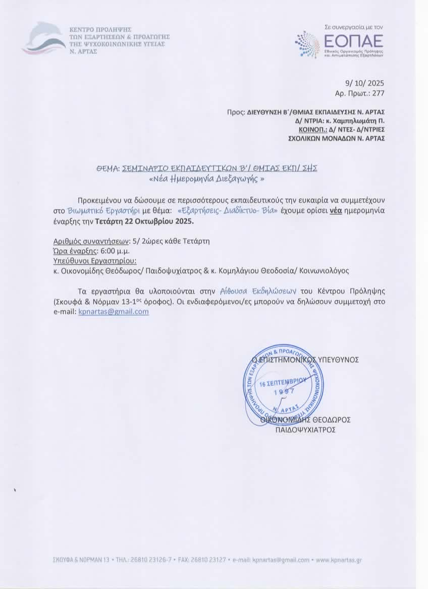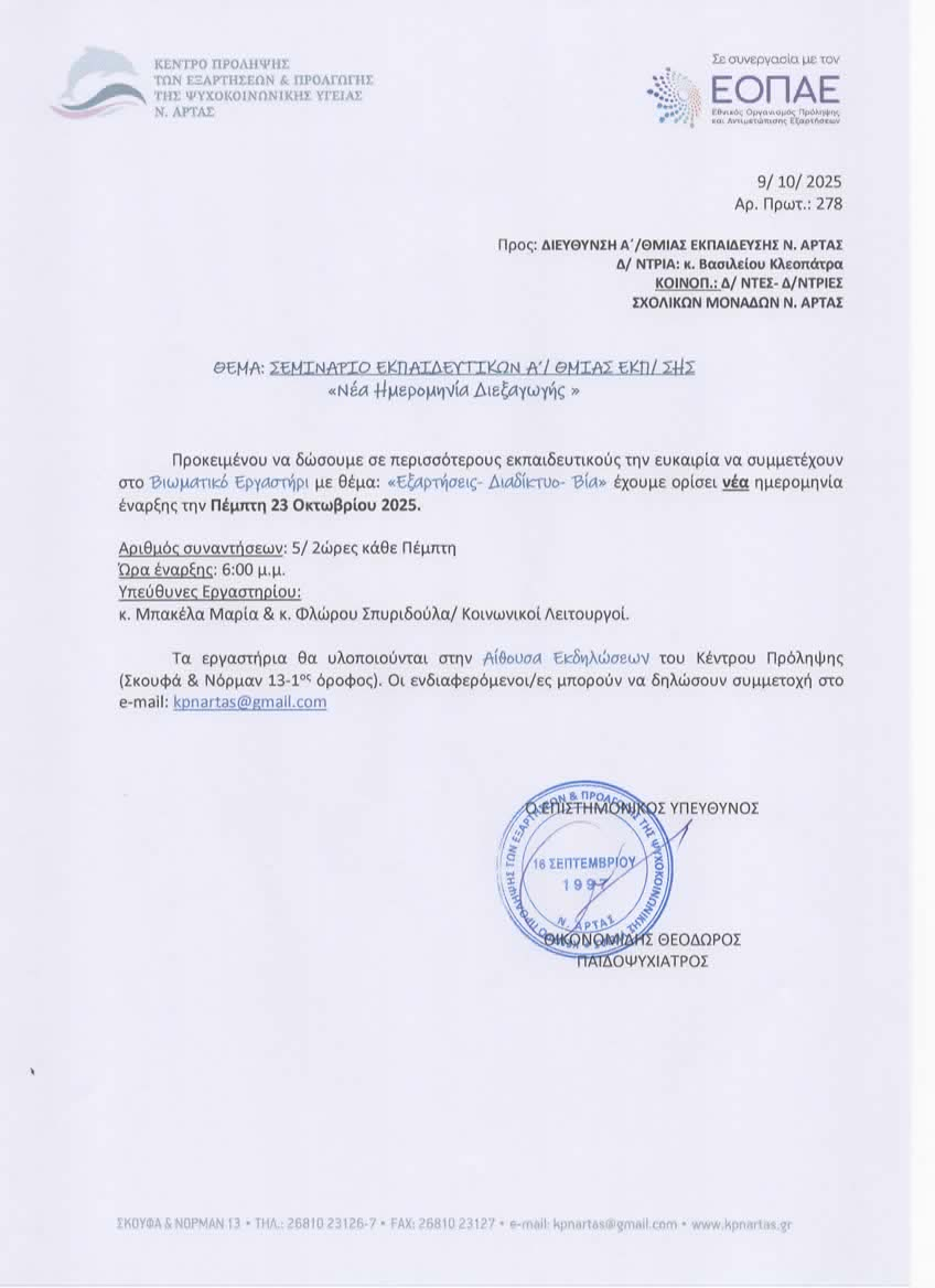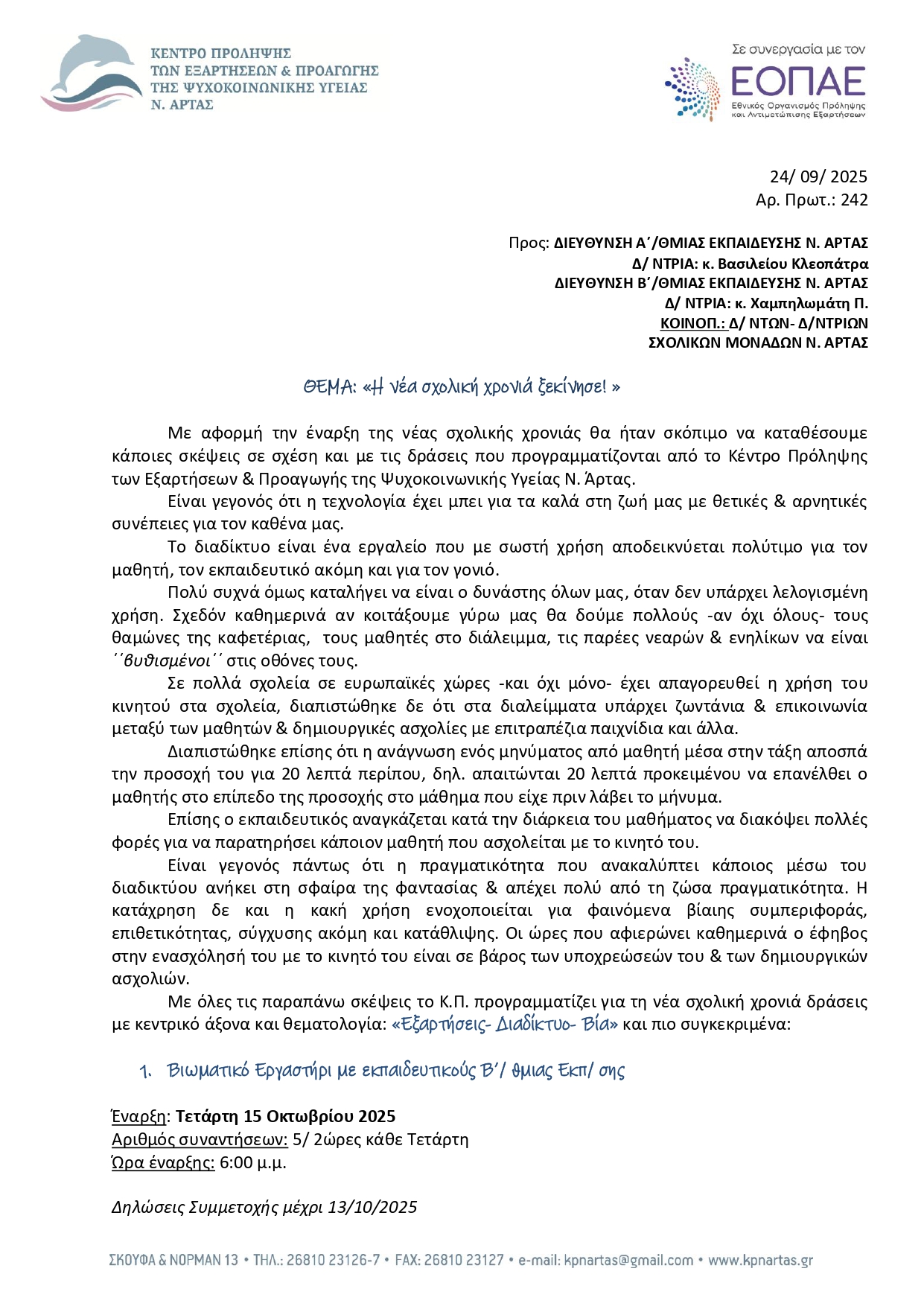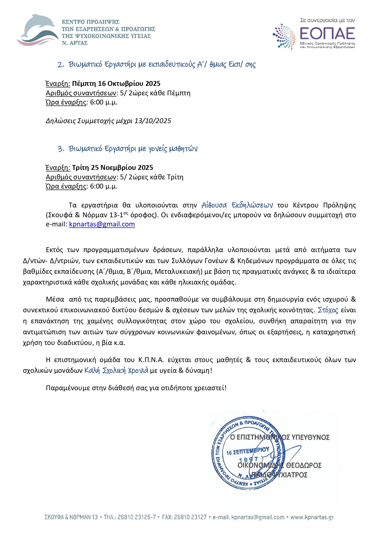 Το Κέντρο Πρόληψης των Εξαρτήσεων και Προαγωγής της Ψυχοκοινωνικής Υγείας N. Άρτας, στο πλαίσιο των προγραμμάτων με τίτλο: «Διευρύνοντας τον κύκλο της Πρόληψης» στην Εκπαιδευτική Κοινότητα 2025, συνέχισε όπως κάθε χρόνο τη συνεργασία με: