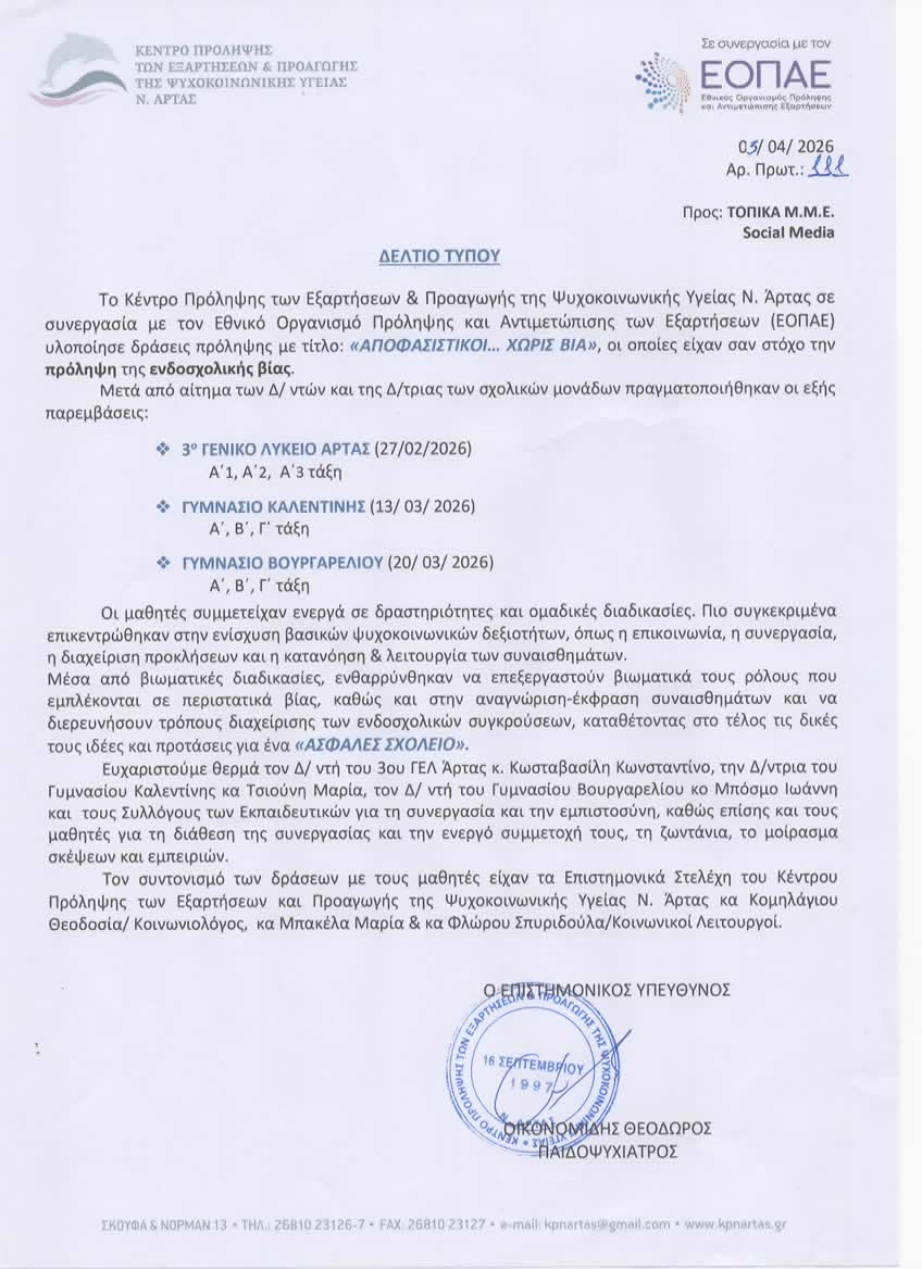Το Κέντρο Πρόληψης των Εξαρτήσεων & Προαγωγής της Ψυχοκοινωνικής Υγείας Ν. Άρτας σε συνεργασία με τον Εθνικό Οργανισμό Πρόληψης και Αντιμετώπισης των Εξαρτήσεων (ΕΟΠΑΕ) στο πλαίσιο των προγραμμάτων του στη σχολική κοινότητα, υλοποίησε δράση ευαισθητοποίησης με τους μαθητές του Γενικού Λυκείου Νεοχωρίου Άρτας με τον τίτλο: «Εξαρτήσεις -Διαδίκτυο- Βία», μετά από αίτημα του σχολείου.